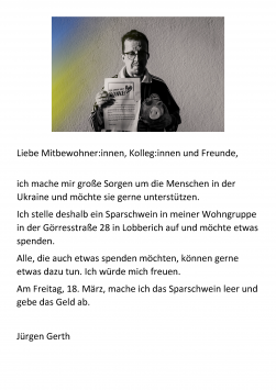 Herr Gerth forderte zunächst seine Mitbewohner:innen auf, Geld zu spenden. Er stellte ein Sparschwein in seiner Wohngruppe auf. Ein Betreuer unterstütze ihn. Schnell wurde ein interner Flyer